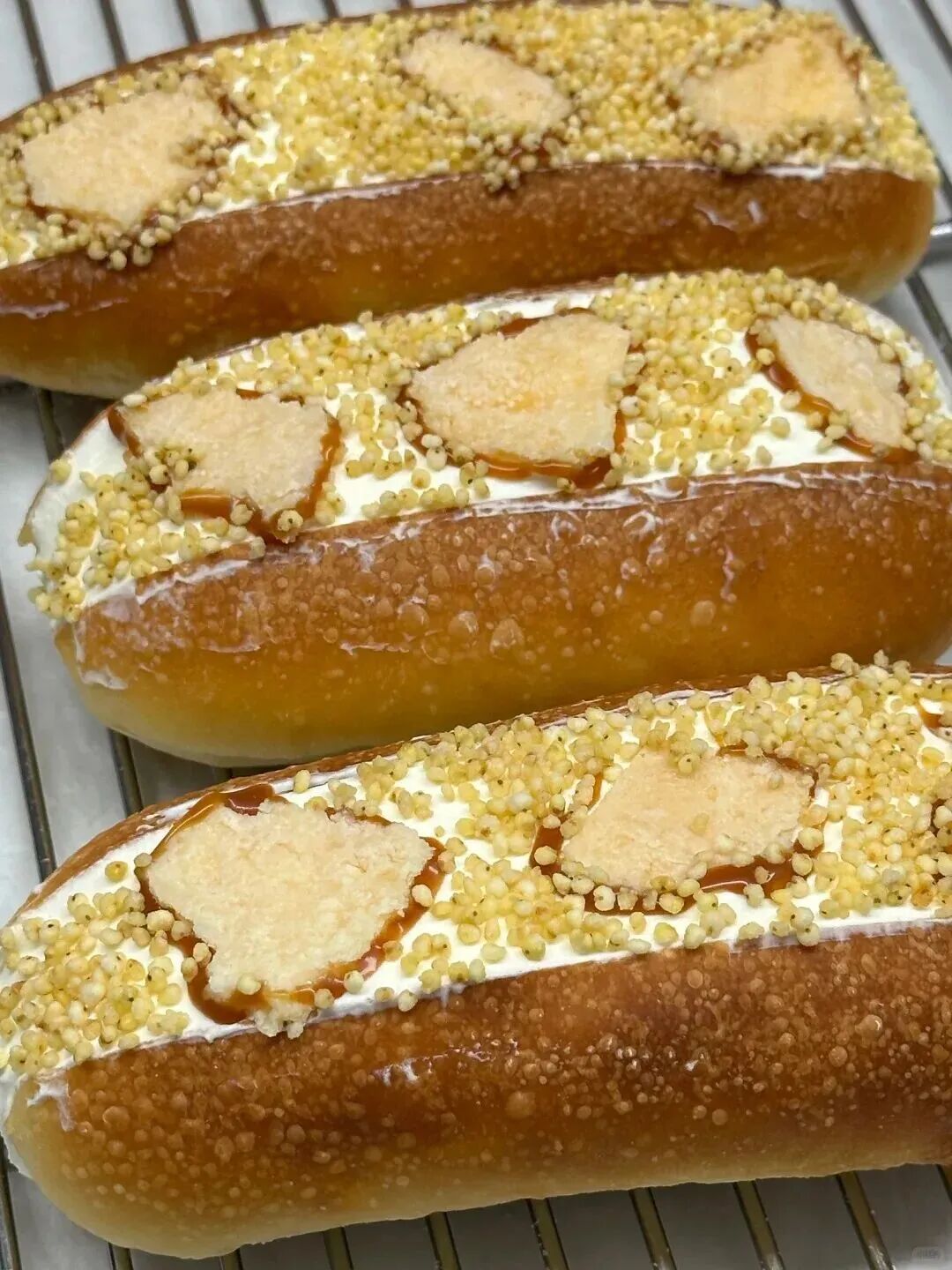 多家面包店同时上架的焦糖奶皮子奶油餐包,一口陷进柔软的奶香之中,焦糖和炒米突出层次感。